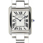 Large size (34.8mm x 27.4mm) stainless steel case, pale silvered opaline dial with Roman numerals, quartz Cartier calibre 690 movement, stainless steel bracelet. Water resistant to 30 meters.