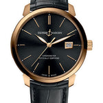 40 mm 18K rose gold case, sapphire crystal, black dial, Caliber UN-815 self-winding movement with COSC certificate, date, leather strap, pin buckle. Water resistant to 50m.