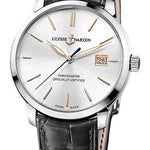 40mm stainless steel case, silver dial, caliber 11 1/2" UN-815 self winding movement, black alligator strap. Water resistant to 50 meters.