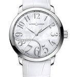 37 mm stainless steel case, sapphire crystal, white mother of pearl dial, Caliber UN-815 self-winding movement with Ulysse Nardin performance certificate, leather strap, folding buckle. Water resistant to 30m.