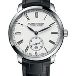 40 mm stainless steel case, sapphire crystal, enamel grand feu white dial, Caliber UN-320 self-winding movement with Ulysse Nardin performance certificate, oversized seconds-hand, date, silicium technology, leather strap, simple buckle. Water resistant to 30m.