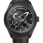 43 mm titanium with dlc case, Caliber UN-230 self-winding movement, openwork veal strap. Water resistant to 50m.