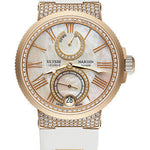 39mm 18K rose gold (5N) case set with 160 diamonds, screw-down security crown crown, sapphire crystal, white mother of pearl dial set with 57 diamonds, Caliber UN-118 Self-winding movement with 60 hours power reserve indicator, oversized seconds-hand, date, rubber strap with 18ct rose gold (5N) element set with 74 diamonds. Water resistant to 100m.