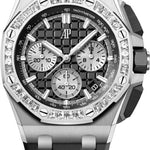 | CASE DETAIL | 18-carat white gold case, bezel set with baguette-cut diamonds, double glareproofed sapphire crystal and caseback, black ceramic pushpieces and screw-locked crown. |