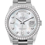 Discover the epitome of elegance and sophistication with the Rolex Day-Date 36 Mother of Pearl Diamond Dial Diamond Bezel White Gold President Watch 128349RBR. A fusion of opulence and precision, this timepiece symbolizes the pinnacle of horological artistry, embodying the essence of timeless luxury.