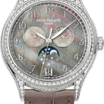 Patek Philippe Complications Ladies Annual Calendar Moon Phase 38mm Black Tahitian Mother of Pearl Arabic White Gold Diamond Set Leather Automatic | 4948G-001