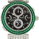 | Case Detail | White gold reversible case. Humidity- and dust-protected only (not water-resistant). Diameter: 49.4 mm. Height: 16.32 mm. Gemsetting: 96 baguette-cut emeralds (bezel time side). 291 baguette-cut diamonds (bezel calendar side and case). |