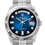 Embrace the fusion of sophistication and innovation, redefine luxury, and make an indelible impression with the Rolex Day-Date 36 Blue Ombré Diamond Dial Fluted Bezel White Gold Diamond President Watch—a true testament to refined taste and distinction.