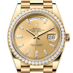 The Rolex Day-Date 40 Automatic with a Champagne Baguette Diamonds Dial, housed within an 18kt Yellow Gold President Men's Watch, exudes an aura of prestige and sophistication, making it an iconic statement piece for the discerning connoisseur.