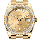 Crafted in sumptuous 18kt yellow gold, the 40mm case paired with the iconic Rolex President bracelet exudes timeless elegance and sophistication, accentuating its status as a pinnacle of luxury timepieces. Its fixed bezel adorned with a stunning array of diamonds adds a captivating allure and elevates its allure.
