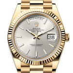The Rolex Day-Date 40 with its Silver Dial and 18K Yellow Gold President Bracelet is a timeless masterpiece, seamlessly blending sophistication with functionality, and stands as a pinnacle of luxury watchmaking.