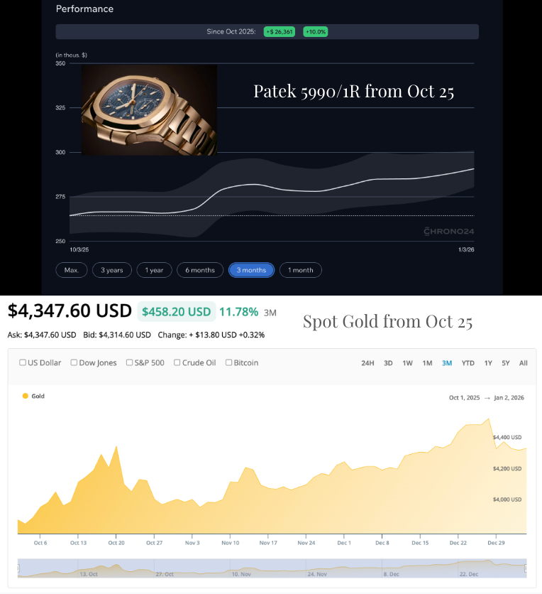 More recently, luxury watches have demonstrated a notable ability to act as a store of value and safety during the trade war. For the past 12 months, secondary values on the all gold Patek Philippe Nautilus have mirrored the rise of spot gold. Money flows to safety, and watches, especially those with precious metals, serve this purpose. This behavior is seen predominantly with not only Patek Philippe but Rolex and Audemars Piguet as well. Even during the market downturns of 2022, watches performed well relative to stocks, and they recovered quickly from the 2008 crash.