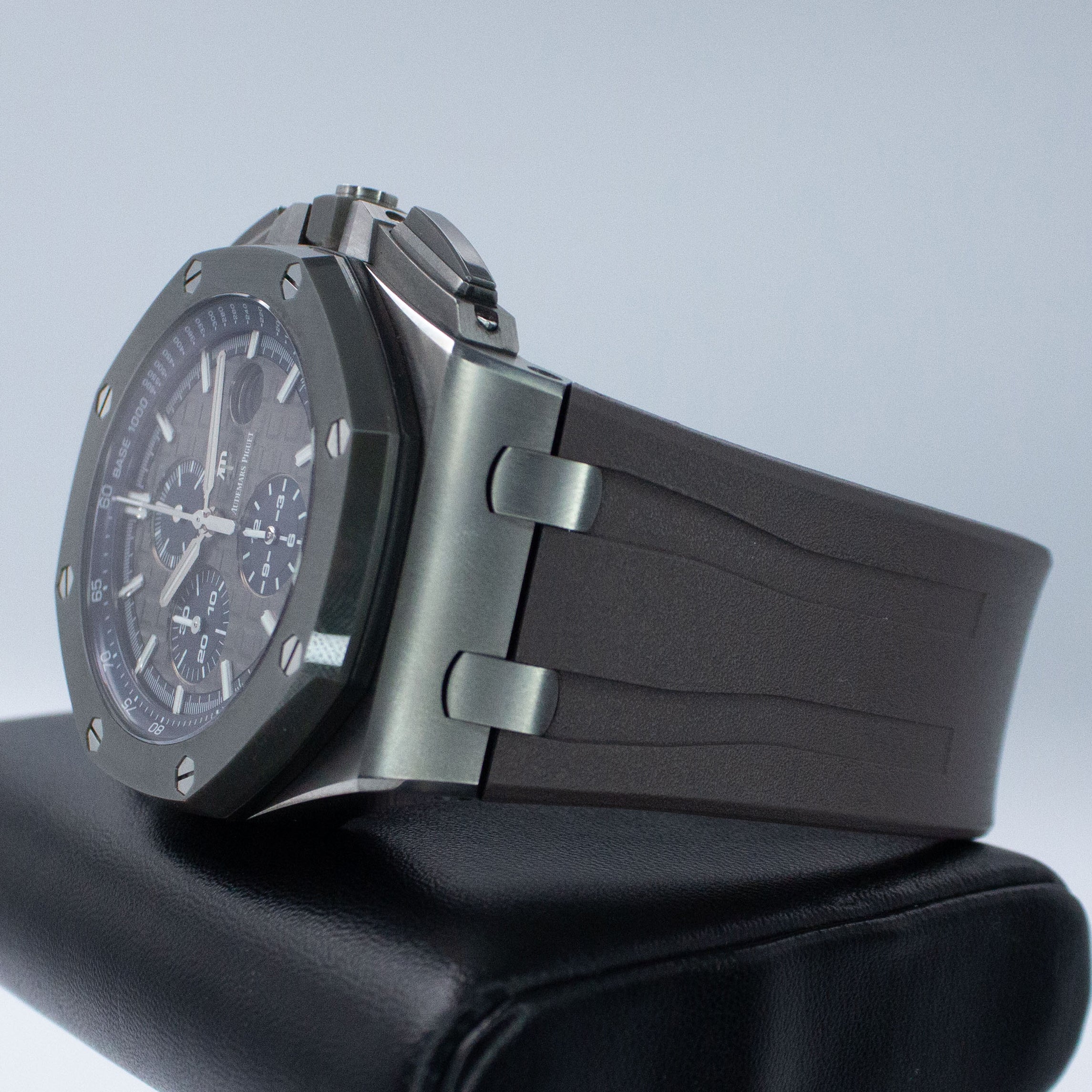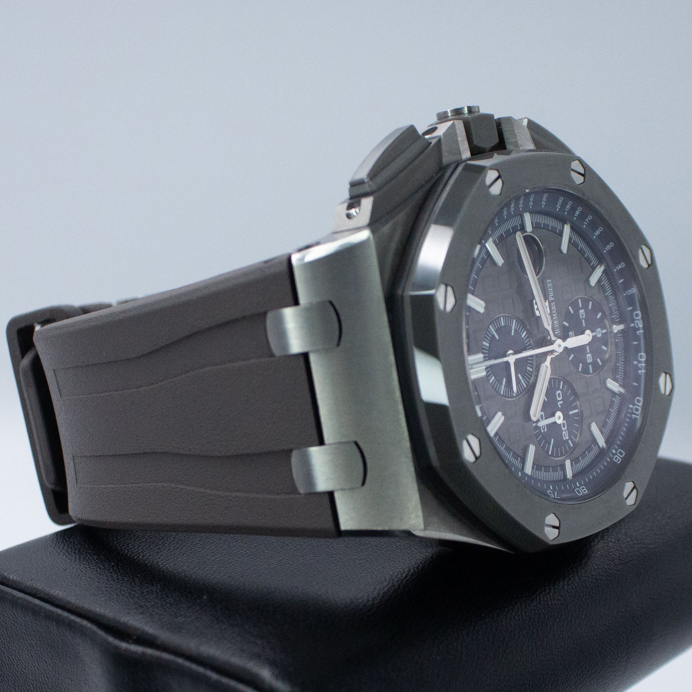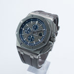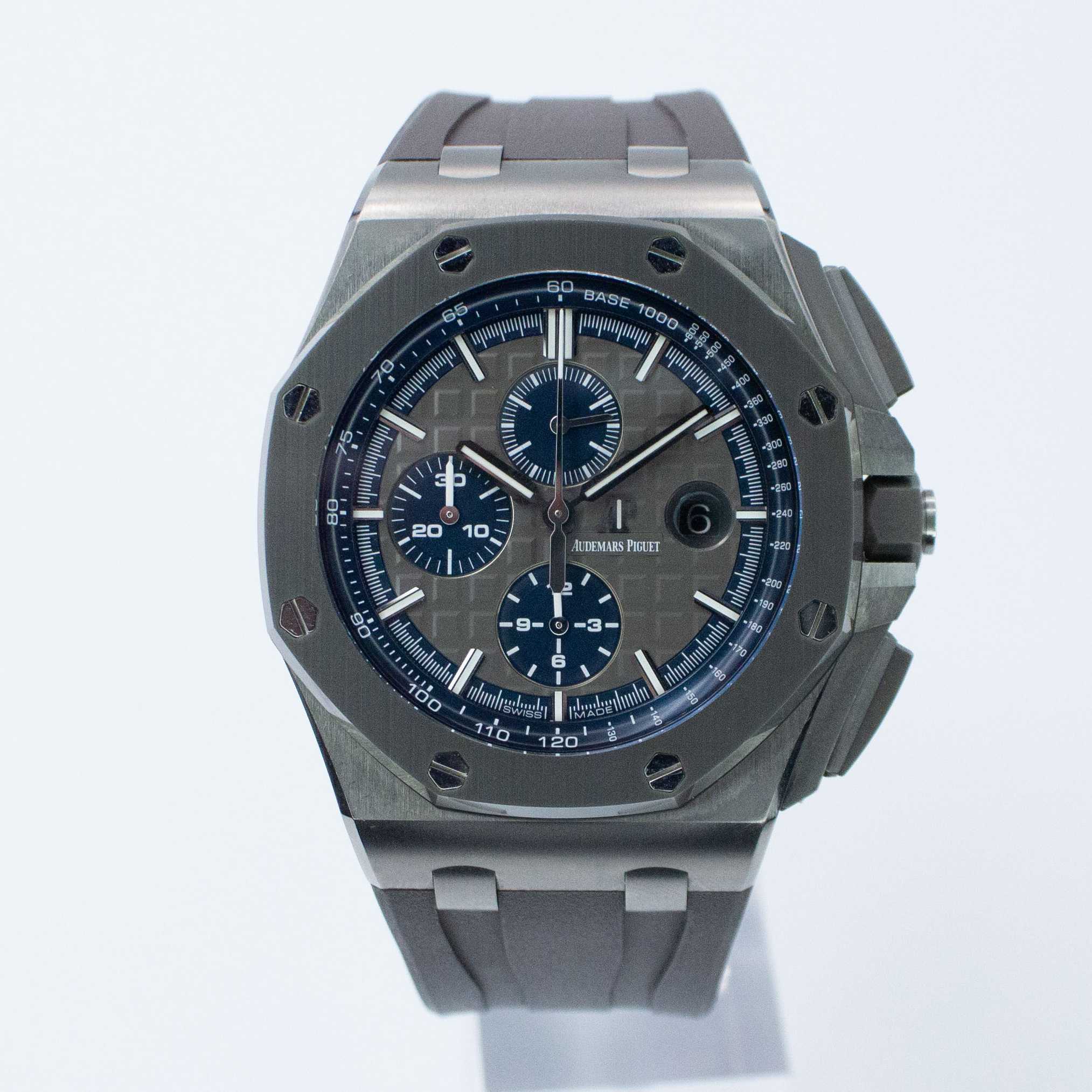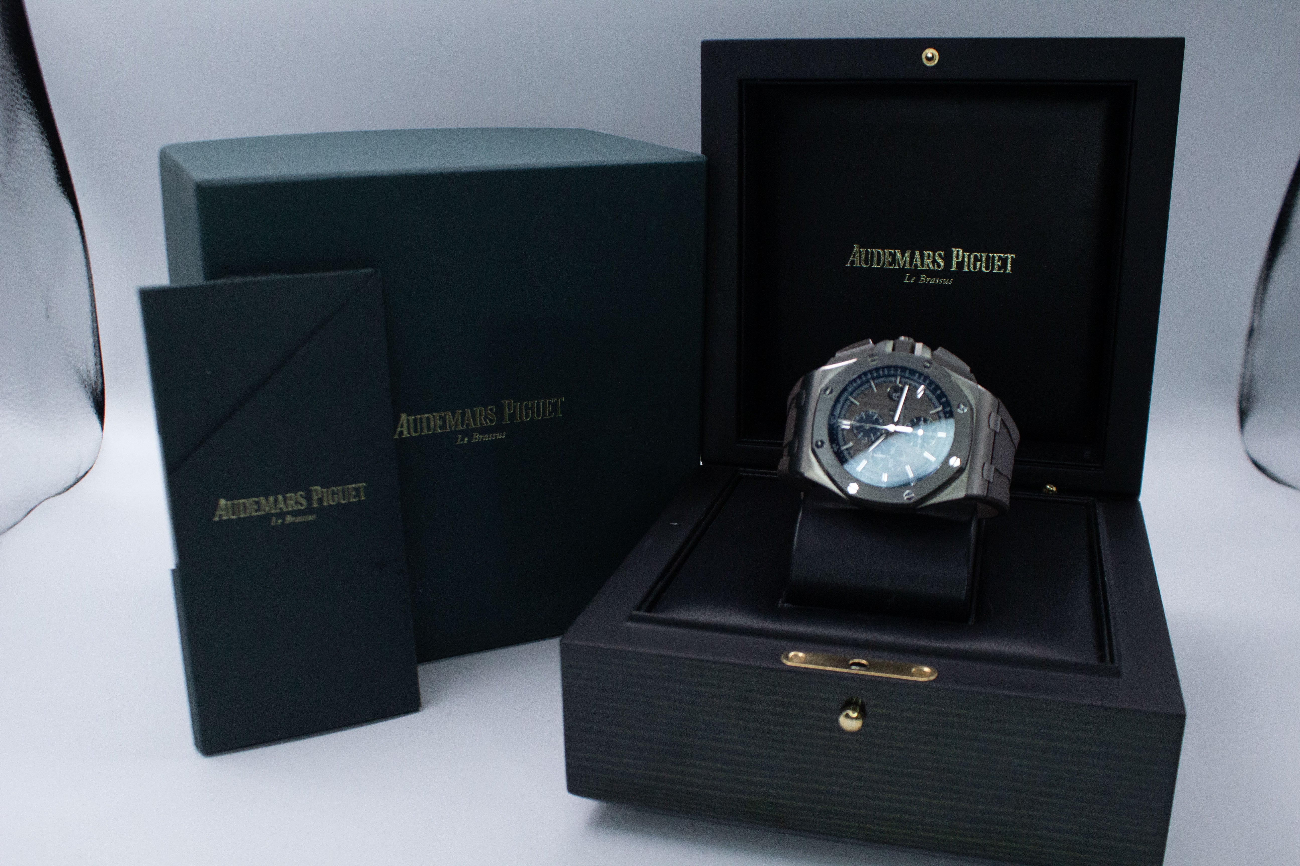 Up for sale is the Audemars Piguet Offshore Chronograph Grey Dial With Blue External Zone 26400IO.OO.A004CA.02.A 44MM Titanium Grey Dial with instructions booklet, warranty card, warranty booklet, and is double boxed. Watch is dated 2021. MSRP $54,910. It was recently placed on a timegrapher and is running well. All of our watches are photographed under high intensity light with a macro lens. Any flaws will be significantly magnified. The serial numbers have been blurred for privacy. Timepiece is in excellent condition showing little to no signs of wear. Timepiece is located in Indiana.