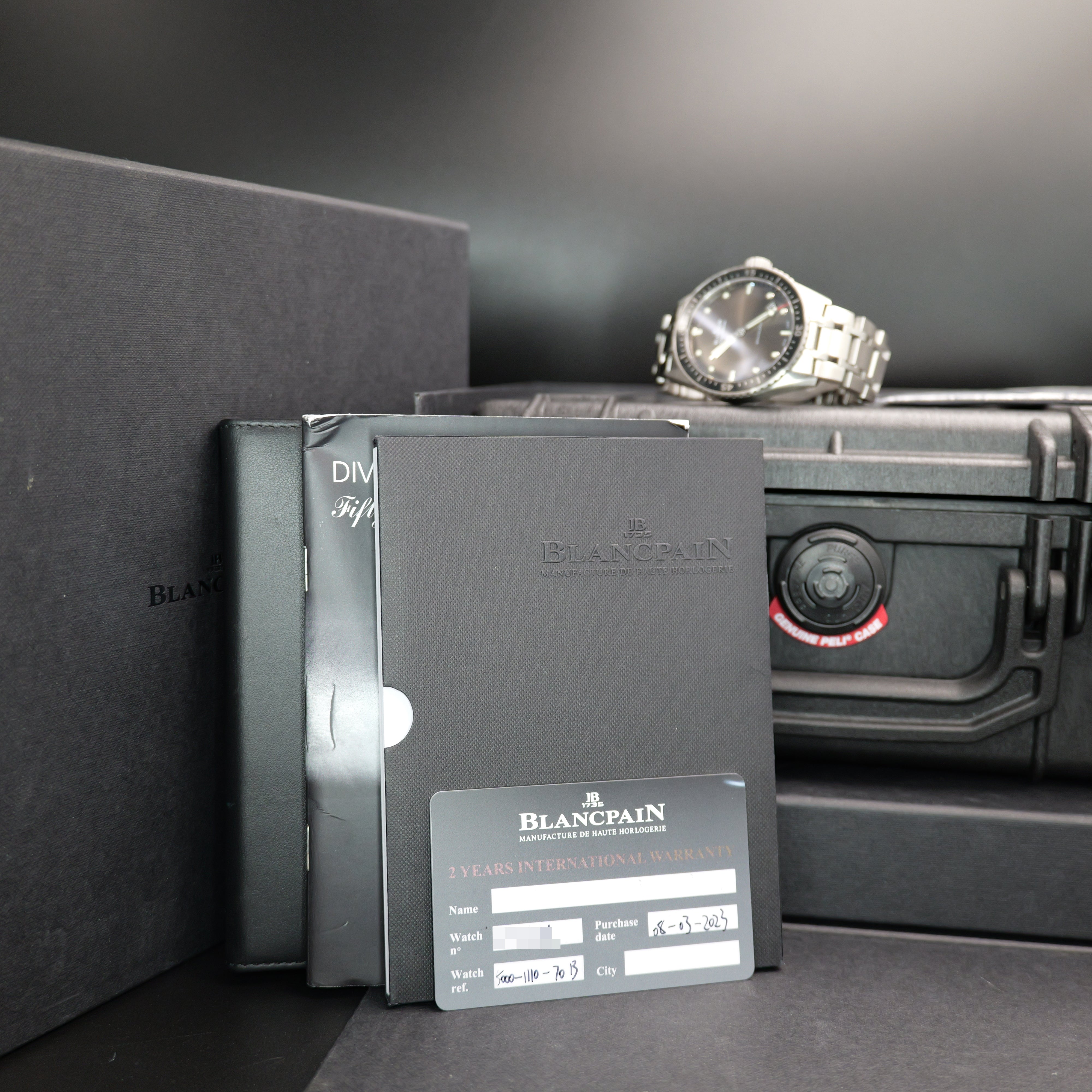 Up for sale is the Blancpain Fifty Fathoms Bathyscaphe 5000-1110-70B 43MM Stainless Steel Grey Dial with Watch Case, Manufacturer Horlogerie, Service booklet, register of connoisseurs, diver's log book, Warranty card, Microfiber cloth, and is double boxed.. Watch is dated 2023. MSRP $17,100. It was recently placed on a timegrapher and is running well. All of our watches are photographed under high intensity light with a macro lens. Any flaws will be significantly magnified. The serial numbers have been blurred for privacy. Timepiece is in exellent condition showing little to no signs of wear. Timepiece is located in Indiana.