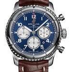 43.00 mm stainless steel case, 13.97 mm thick, screw-locked crown with two gaskets, cambered sapphire crystal with glareproof treatment on both sides, blue dial, Breitling 01 (Manufacture) self-winding movement, approximately approx. 70 hrs of power reserve, brown alligator leather strap, tang buckle. Water resistant to 100 m (330 ft).