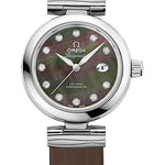 34 mm steel case, transparent back, self-locking crown, steel bezel, sapphire crystal with anti-reflective treatment on both sides, black dial set with 11 diamonds indexes, caliber 8520 self-winding movement with date window at 3 o'clock, approximately 50 hours of power reserve, brown leather strap. Water resistant to 100 m (330 ft).