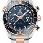 45.5 mm 18K Sedna gold and stainless steel case with anti-magnetic properties and helium escape valve, transparent back, screw-in crown, unidirectional rotating blue ceramic bezel with Ceragold diving scale, scratch-resistant sapphire crystal, blue ceramic dial with Arabic numerals and a date window at the 6 o’clock position, small seconds sub-dial, as well as 60-minute and 12-hour counters on one dial, caliber Omega 9900 self-winding Co-Axial master chronometer movement with chronograph function, approximately 60 hours of power reserve, 18K Sedna gold and stainless steel bracelet, extendable foldover buckle. Water resistant to 600 m (2000 ft).