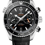 45.5 mm stainless steel case with anti-magnetic properties and helium escape valve, transparent back, screw-in crown, unidirectional rotating black ceramic bezel with Liquidmetal diving scale, scratch-resistant sapphire crystal, black ceramic dial with Arabic numerals and a date window at the 6 o’clock position, small seconds sub-dial, as well as 60-minute and 12-hour counters on one dial, caliber Omega 9900 self-winding Co-Axial master chronometer movement with chronograph function, approximately 60 hours of power reserve, black leather strap with rubber lining. Water resistant to 600 m (2000 ft).