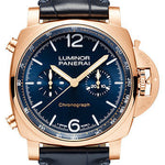 44mm polished Goldtech case, polished Goldtech bezel, blue sun-brushed dial with luminous arabic numerals and hour markers, hollowed chronograph minutes counter at 3 o’clock and small seconds counter at 9 o’clock, central chronograph seconds hands, tachymeter scale in the external “rehaut”, P.9200 calibre automatic movement, dark blue alligator strap with beige stitching. Water resistant to 5 bar (~50 metres).