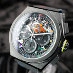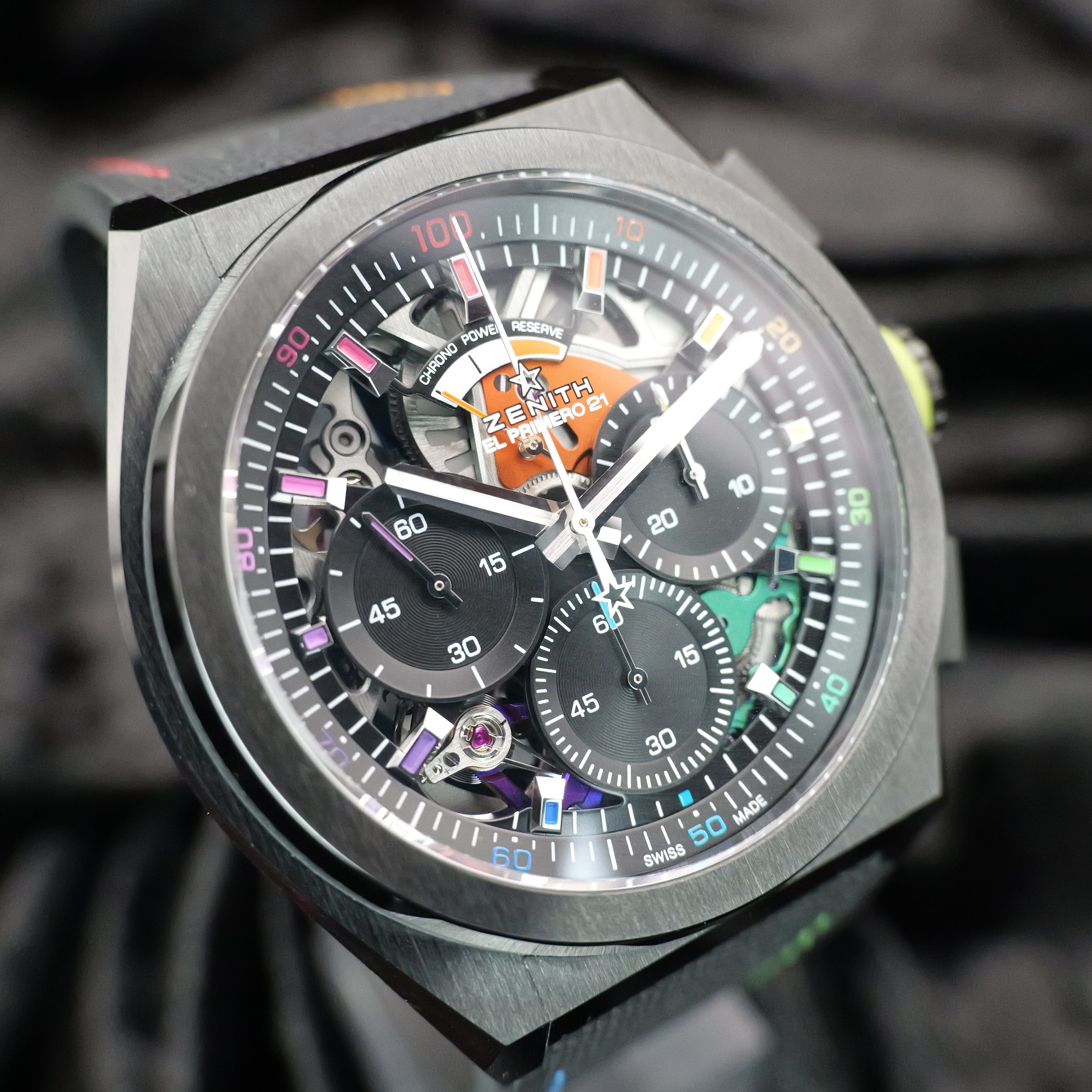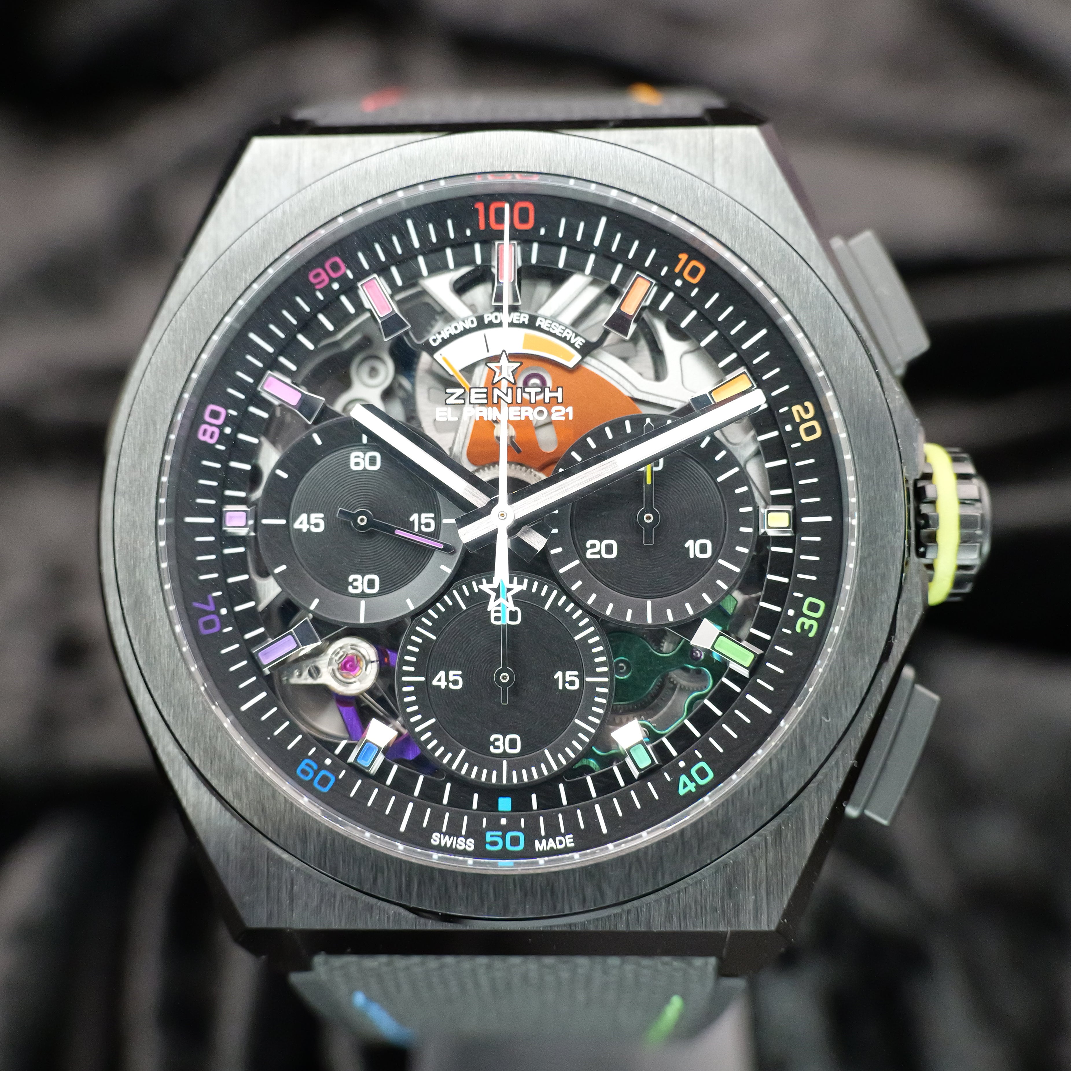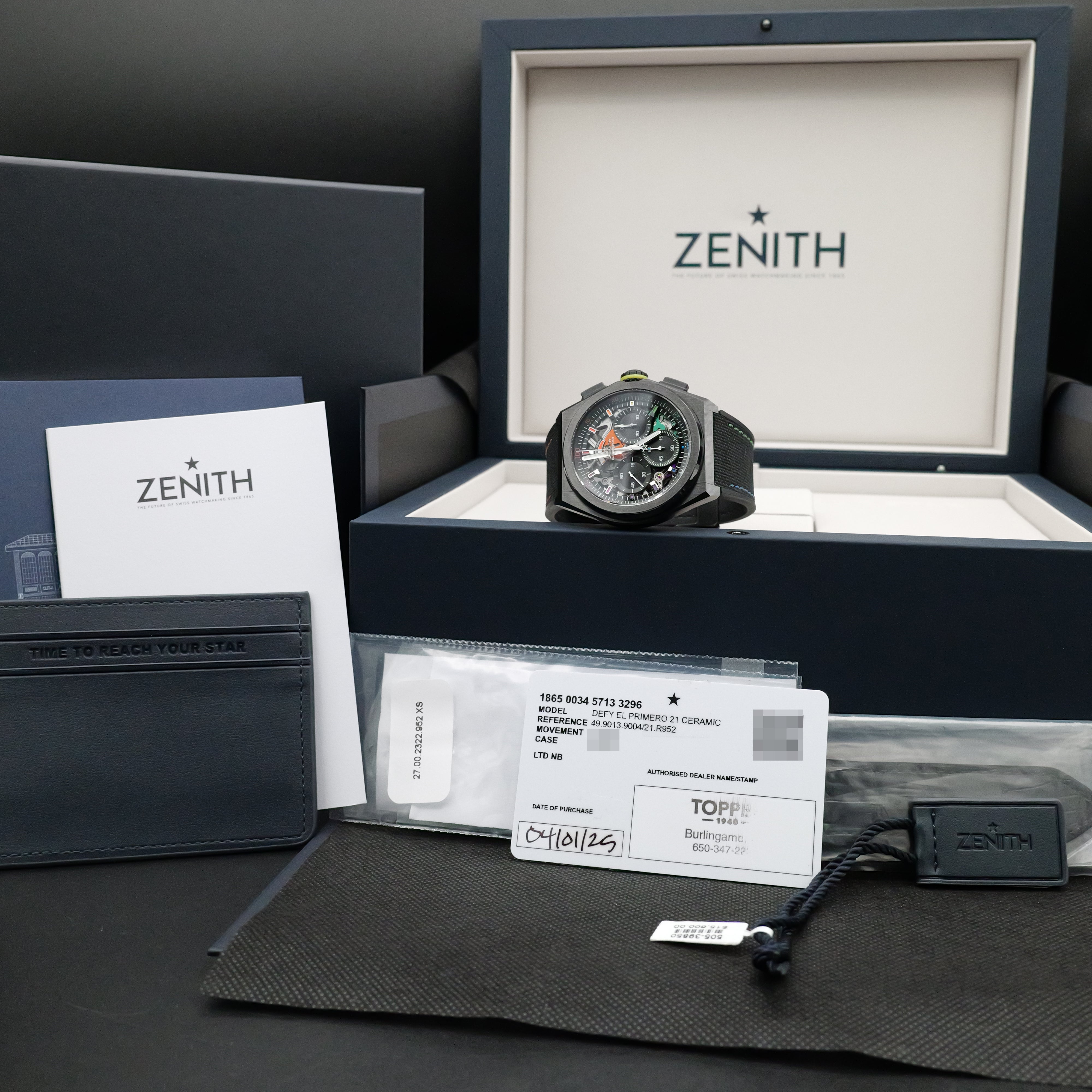 Up for sale is the Zenith Defy 21 Chroma Ii 49.9013.9004/21.R952 44MM Ceramic Black Dial Full Set WARRANTY with Quick step guide booklet, certification pamphlet, hang tag, warranty card, crocodile leather strap, black chroma strap, microfiber cloth, and is triple boxed with sleeve. Watch is dated 2025. MSRP $15600. It was recently placed on a timegrapher and is running well. All of our watches are photographed under high intensity light with a macro lens. Any flaws will be significantly magnified. The serial numbers have been blurred for privacy. Timepiece is in excellent condition showing little to no signs of wear. Timepiece is located in Indiana.