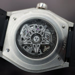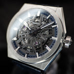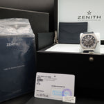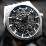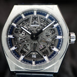 Up for sale is the Zenith Defy Classic Titianuim 95.9000.670/78.R584 41MM Skeleton Dial with Warranty card, microfiber cloth, USB, quickstep guide, card holder, and is double boxed. Watch is dated 2021. MSRP $7000. It was recently placed on a timegrapher and is running well. All of our watches are photographed under high intensity light with a macro lens. Any flaws will be significantly magnified. The serial numbers have been blurred for privacy. TImepiece is in mint condition and is located in Indiana.