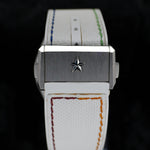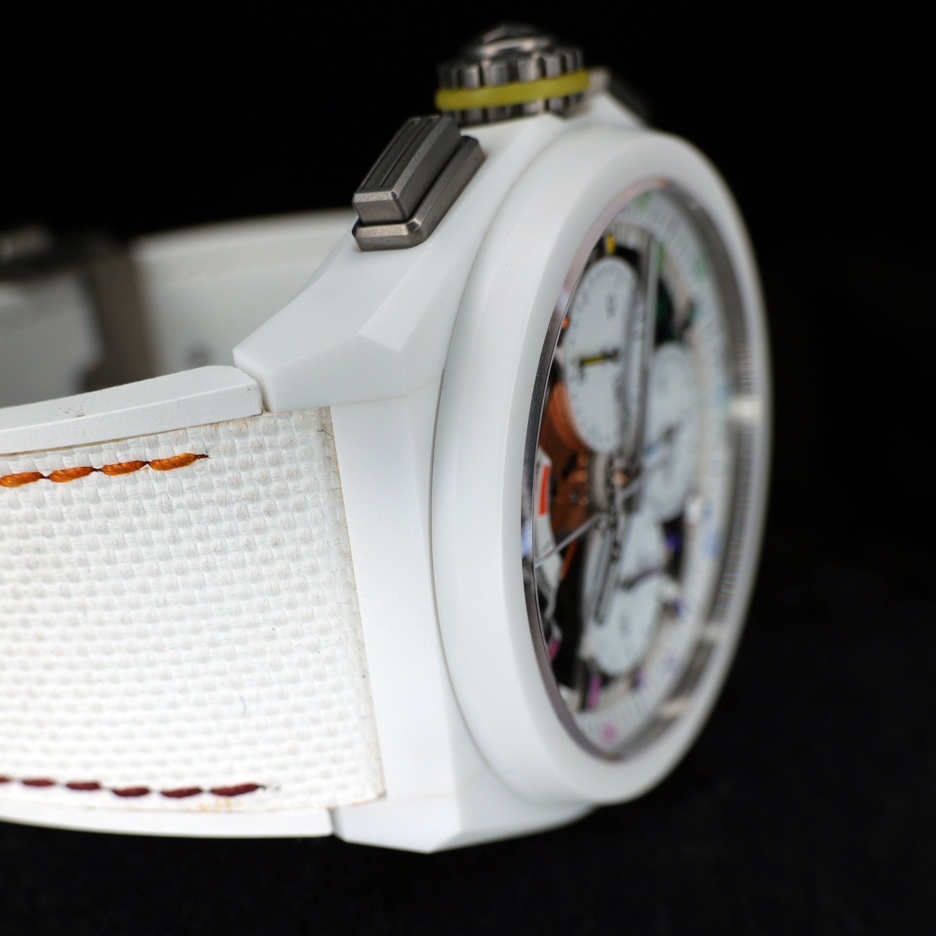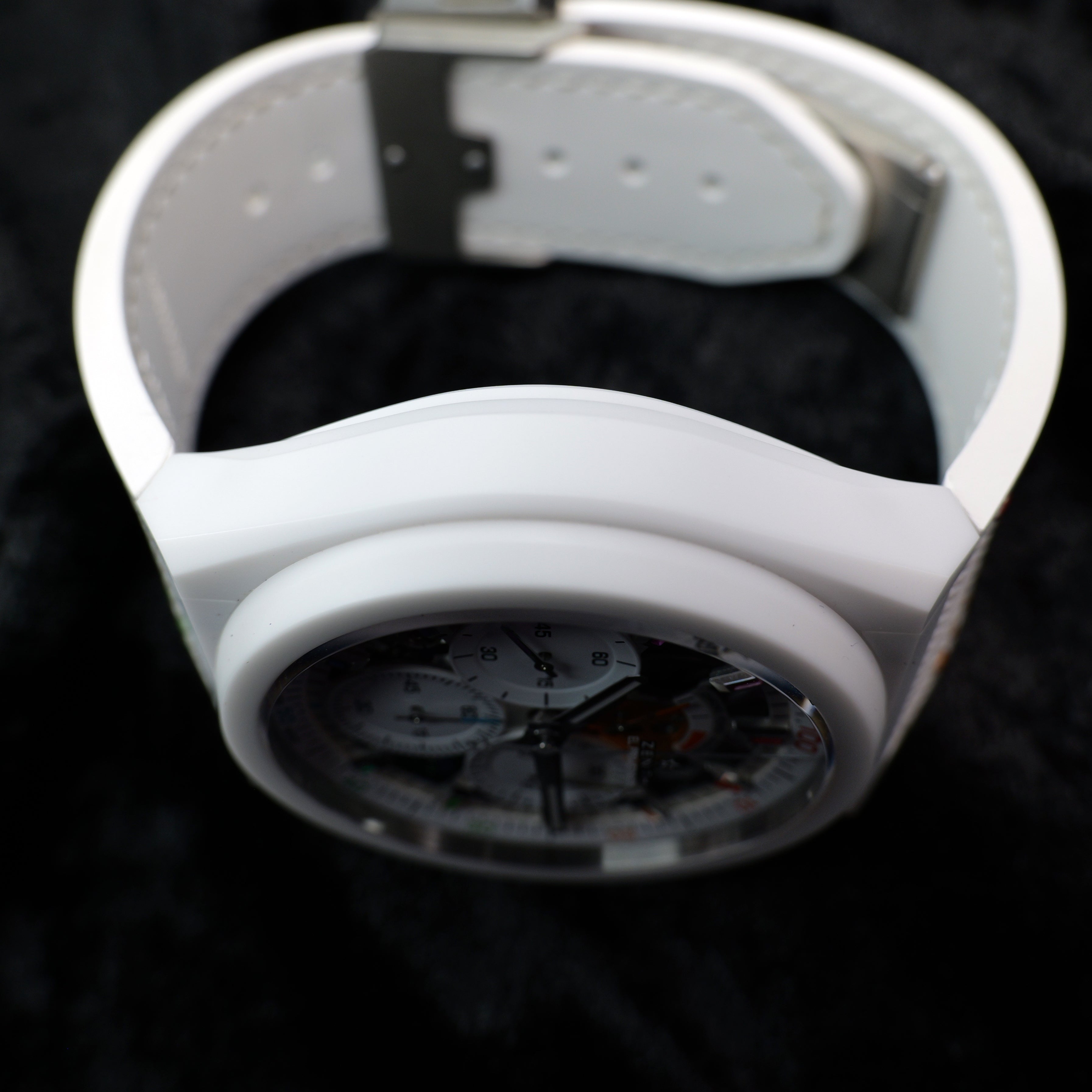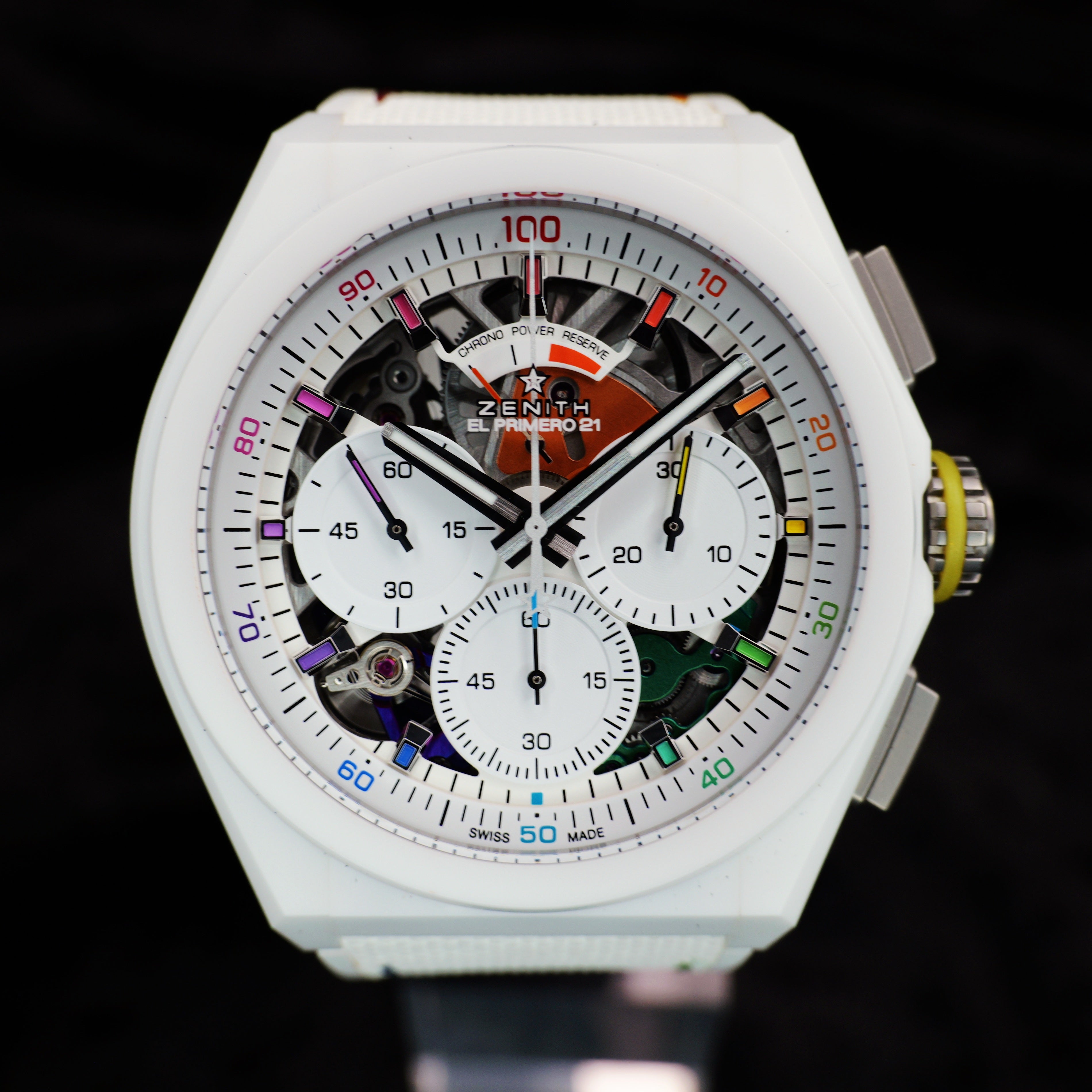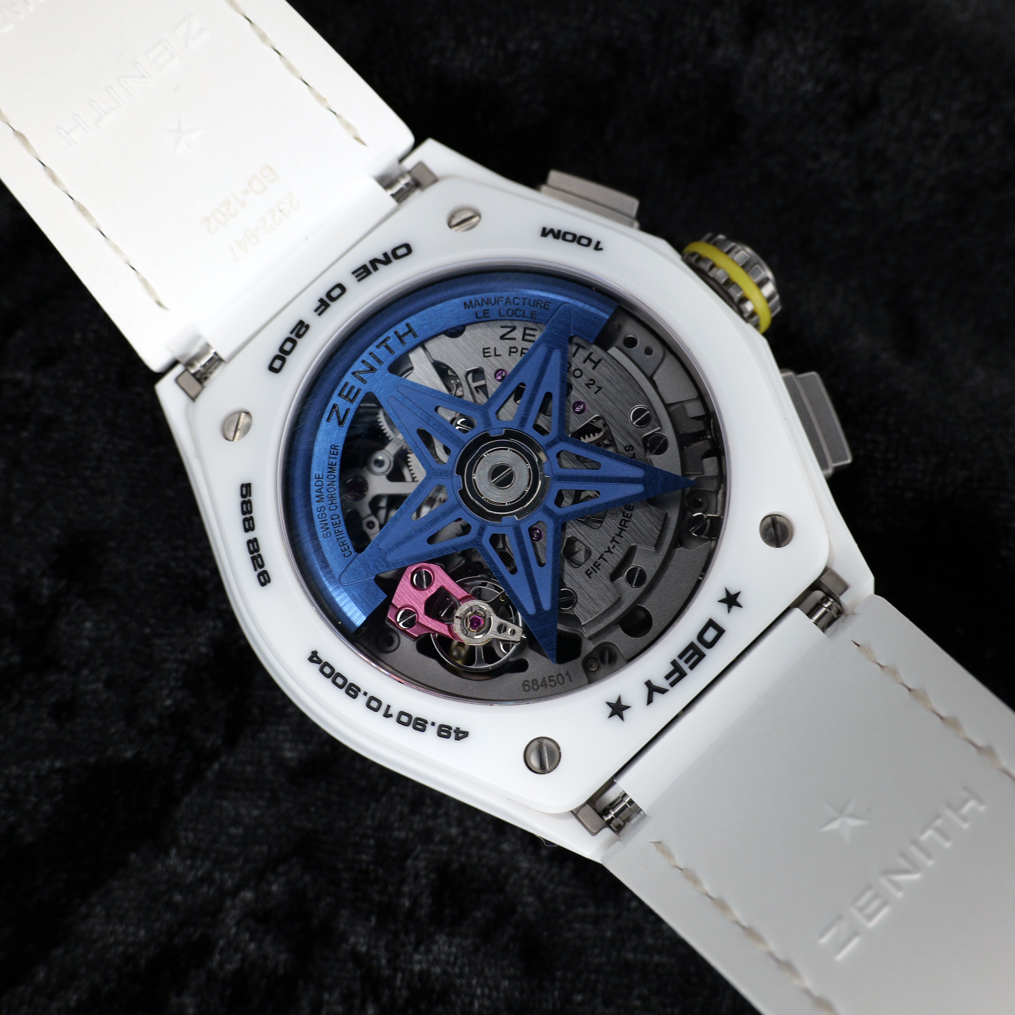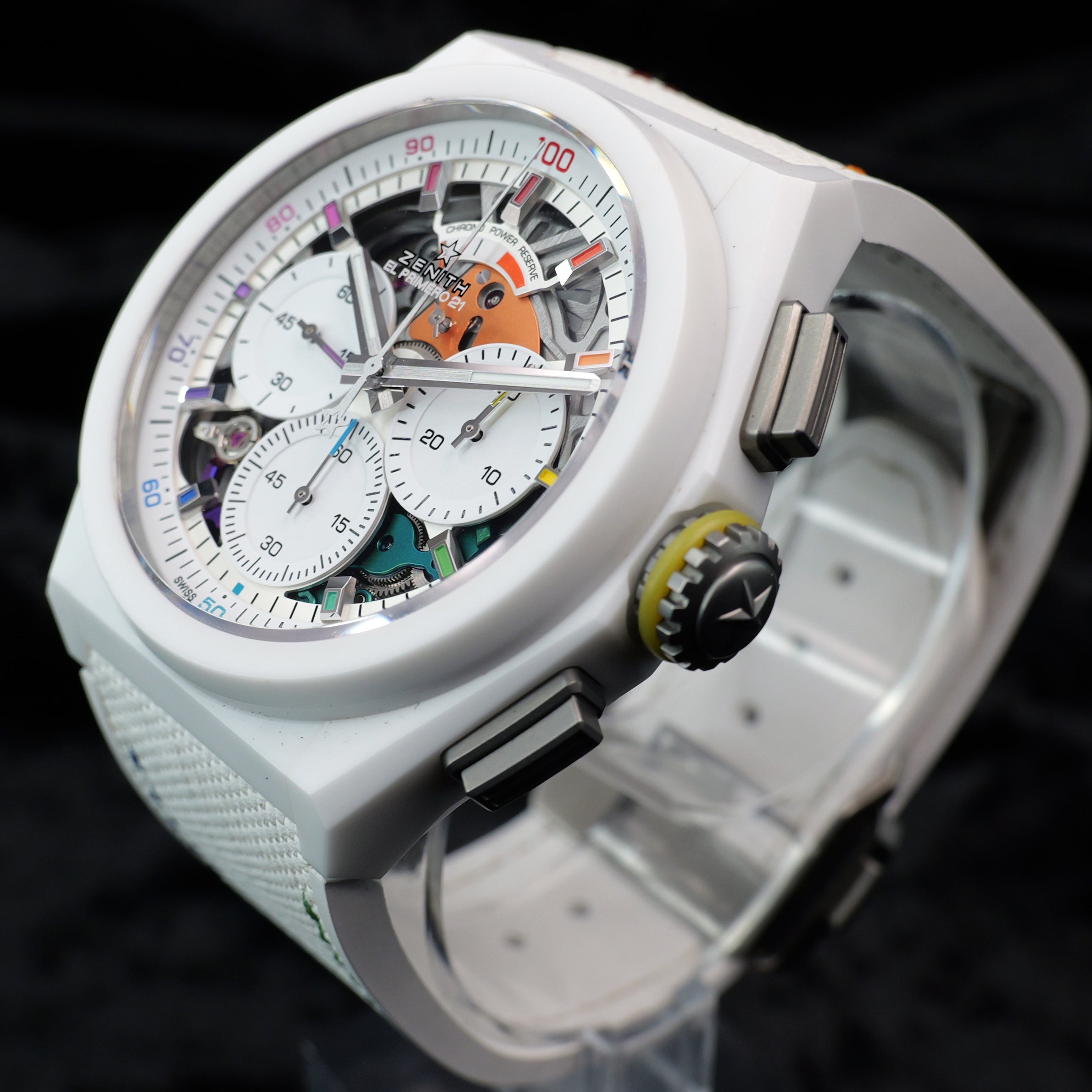 Up for sale is the Zenith Defy El Primero 21 Chroma 49.9010.9004/01.R974 44MM Ceramic Skeleton Dial with Hangtag, Quick Startup Guide, Warranty Card, Microfiber Cloth, and is double boxed with sleeve. Watch is dated 2025. MSRP $14,500. It was recently placed on a timegrapher and is running well. All of our watches are photographed under high intensity light with a macro lens. Any flaws will be significantly magnified. The serial numbers have been blurred for privacy. Timepiece is in mint condition. Timepiece is located in Indiana.